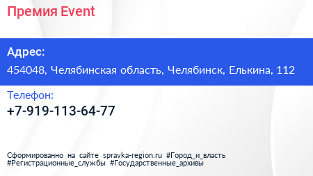 Премия Event по адресу 454048, Челябинская область, Челябинск, Елькина, 112 в дальнейшем Организация, размещена в следующих категориях: