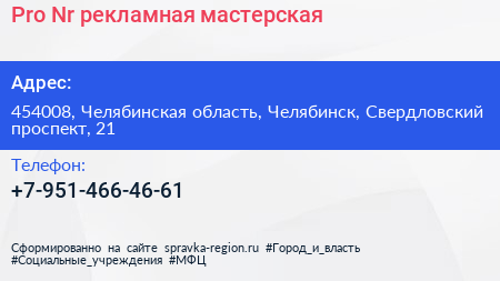 Pro-Nr, рекламная мастерская по адресу 454008, Челябинская область, Челябинск, Свердловский проспект, 21 в дальнейшем Организация, размещена в следующих категориях: