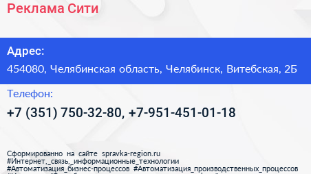 Реклама Сити по адресу 454080, Челябинская область, Челябинск, Витебская, 2Б в дальнейшем Организация, размещена в следующих категориях: