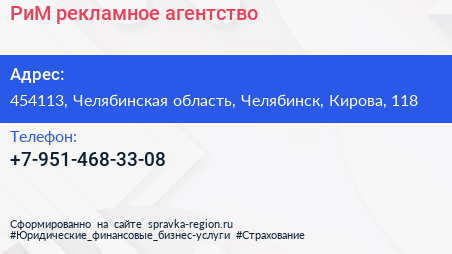РиМ, рекламное агентство по адресу 454113, Челябинская область, Челябинск, Кирова, 118 в дальнейшем Организация, размещена в следующих категориях: