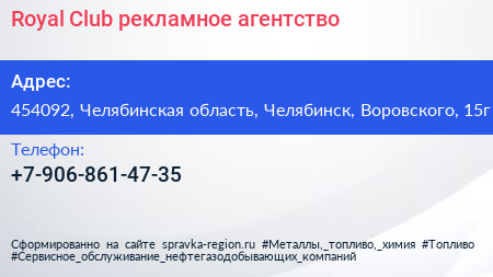 Royal Club, рекламное агентство по адресу 454092, Челябинская область, Челябинск, Воровского, 15г в дальнейшем Организация, размещена в следующих категориях: