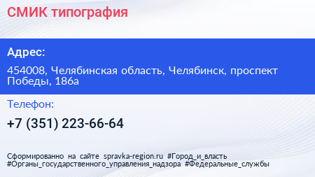 СМИК, типография по адресу 454008, Челябинская область, Челябинск, проспект Победы, 186а в дальнейшем Организация, размещена в следующих категориях: