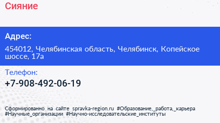Сияниe по адресу 454012, Челябинская область, Челябинск, Копейское шоссе, 17а в дальнейшем Организация, размещена в следующих категориях: