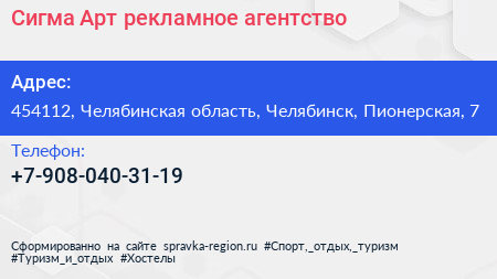 Сигма Арт, рекламное агентство по адресу 454112, Челябинская область, Челябинск, Пионерская, 7 в дальнейшем Организация, размещена в следующих категориях:
