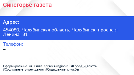 Синегорье, газета по адресу 454080, Челябинская область, Челябинск, проспект Ленина, 81 в дальнейшем Организация, размещена в следующих категориях: