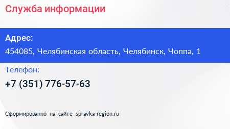 Служба информации по адресу 454085, Челябинская область, Челябинск, Чоппа, 1 в дальнейшем Организация, размещена в следующих категориях: