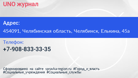 UNO, журнал по адресу 454091, Челябинская область, Челябинск, Елькина, 45а в дальнейшем Организация, размещена в следующих категориях: