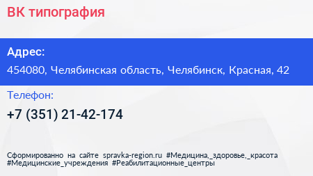 ВК, типография по адресу 454080, Челябинская область, Челябинск, Красная, 42 в дальнейшем Организация, размещена в следующих категориях:
