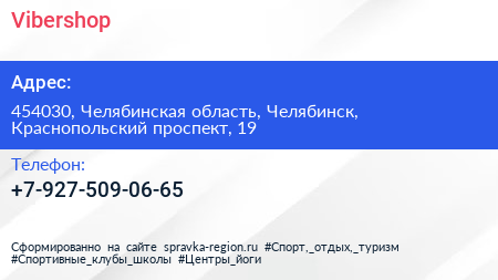 Vibershop по адресу 454030, Челябинская область, Челябинск, Краснопольский проспект, 19 в дальнейшем Организация, размещена в следующих категориях: