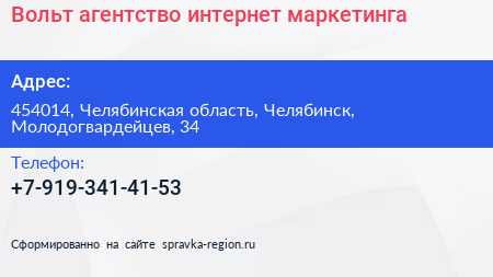 Вольт, агентство интернет-маркетинга по адресу 454014, Челябинская область, Челябинск, Молодогвардейцев, 34 в дальнейшем Организация, размещена в следующих категориях: