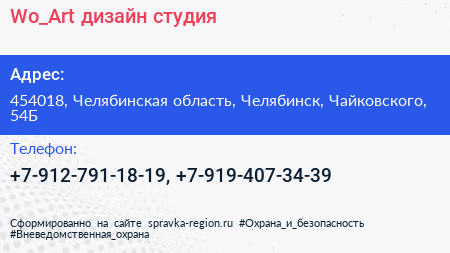 Wo_Art, дизайн-студия по адресу 454018, Челябинская область, Челябинск, Чайковского, 54Б в дальнейшем Организация, размещена в следующих категориях: