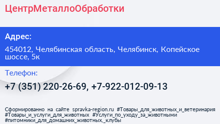 ЦентрМеталлоОбработки по адресу 454012, Челябинская область, Челябинск, Копейское шоссе, 5к в дальнейшем Организация, размещена в следующих категориях: