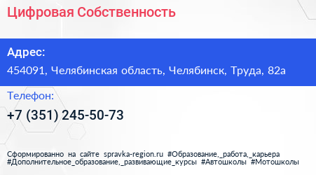 Цифровая Собственность по адресу 454091, Челябинская область, Челябинск, Труда, 82а в дальнейшем Организация, размещена в следующих категориях: