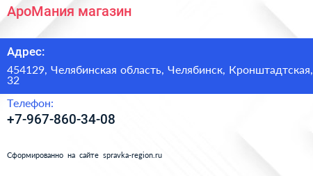 АроМания, магазин по адресу 454129, Челябинская область, Челябинск, Кронштадтская, 32 в дальнейшем Организация, размещена в следующих категориях: