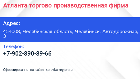 Атланта, торгово-производственная фирма по адресу 454008, Челябинская область, Челябинск, Автодорожная, 3 в дальнейшем Организация, размещена в следующих категориях: