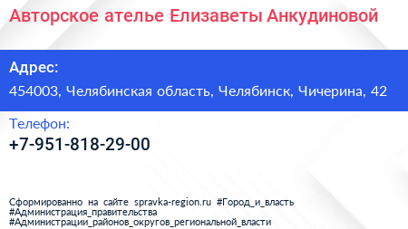 Авторское ателье Елизаветы Анкудиновой по адресу 454003, Челябинская область, Челябинск, Чичерина, 42 в дальнейшем Организация, размещена в следующих категориях:
