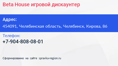 Beta House, игровой дискаунтер по адресу 454091, Челябинская область, Челябинск, Кирова, 86 в дальнейшем Организация, размещена в следующих категориях: