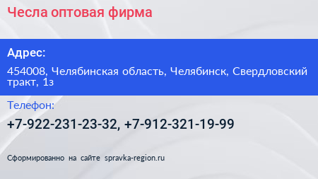 Чесла, оптовая фирма по адресу 454008, Челябинская область, Челябинск, Свердловский тракт, 1з в дальнейшем Организация, размещена в следующих категориях:
