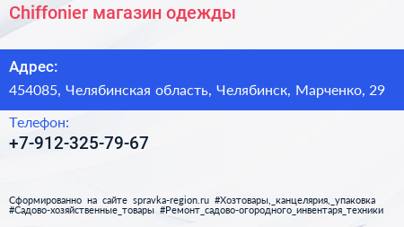 Chiffonier, магазин одежды по адресу 454085, Челябинская область, Челябинск, Марченко, 29 в дальнейшем Организация, размещена в следующих категориях: