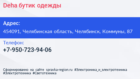 Deha, бутик одежды по адресу 454091, Челябинская область, Челябинск, Коммуны, 87 в дальнейшем Организация, размещена в следующих категориях: