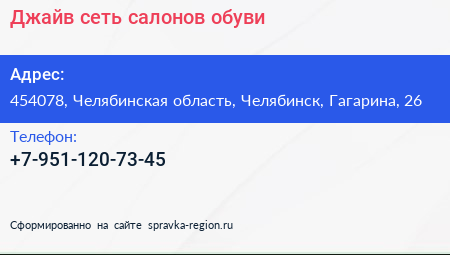 Джайв, сеть салонов обуви по адресу 454078, Челябинская область, Челябинск, Гагарина, 26 в дальнейшем Организация, размещена в следующих категориях: