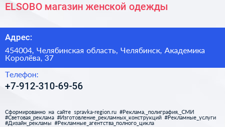 ELSOBO, магазин женской одежды по адресу 454004, Челябинская область, Челябинск, Академика Королёва, 37 в дальнейшем Организация, размещена в следующих категориях: