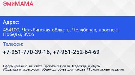 ЭмиМАМА по адресу 454100, Челябинская область, Челябинск, проспект Победы, 390а в дальнейшем Организация, размещена в следующих категориях: