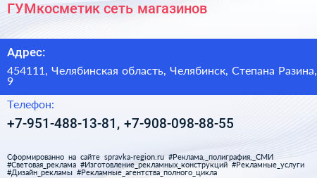 ГУМкосметик, сеть магазинов по адресу 454111, Челябинская область, Челябинск, Степана Разина, 9 в дальнейшем Организация, размещена в следующих категориях: