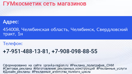ГУМкосметик, сеть магазинов по адресу 454008, Челябинская область, Челябинск, Свердловский тракт, 1н в дальнейшем Организация, размещена в следующих категориях: