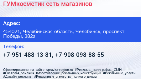 ГУМкосметик, сеть магазинов по адресу 454021, Челябинская область, Челябинск, проспект Победы, 382а в дальнейшем Организация, размещена в следующих категориях: