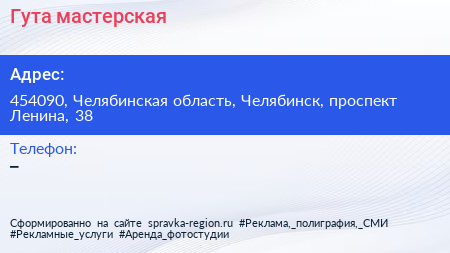 Гута, мастерская по адресу 454090, Челябинская область, Челябинск, проспект Ленина, 38 в дальнейшем Организация, размещена в следующих категориях: