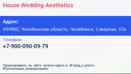 House Wedding Aesthetics по адресу 454902, Челябинская область, Челябинск, Северная, 15а в дальнейшем Организация, размещена в следующих категориях: