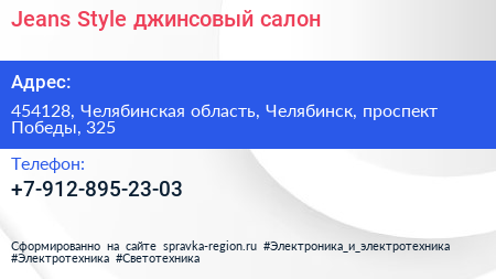 Jeans Style, джинсовый салон по адресу 454128, Челябинская область, Челябинск, проспект Победы, 325 в дальнейшем Организация, размещена в следующих категориях: