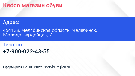 Keddo, магазин обуви по адресу 454138, Челябинская область, Челябинск, Молодогвардейцев, 7 в дальнейшем Организация, размещена в следующих категориях: