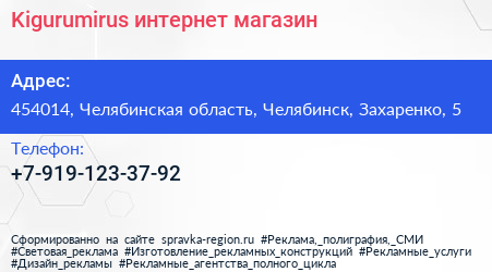 Kigurumirus, интернет-магазин по адресу 454014, Челябинская область, Челябинск, Захаренко, 5 в дальнейшем Организация, размещена в следующих категориях: