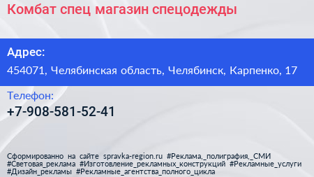 Комбат-спец, магазин спецодежды по адресу 454071, Челябинская область, Челябинск, Карпенко, 17 в дальнейшем Организация, размещена в следующих категориях: