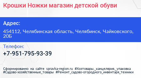 Крошки-Ножки, магазин детской обуви по адресу 454112, Челябинская область, Челябинск, Чайковского, 20Б в дальнейшем Организация, размещена в следующих категориях: