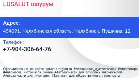 LUSALUT, шоурум по адресу 454091, Челябинская область, Челябинск, Пушкина, 12 в дальнейшем Организация, размещена в следующих категориях: