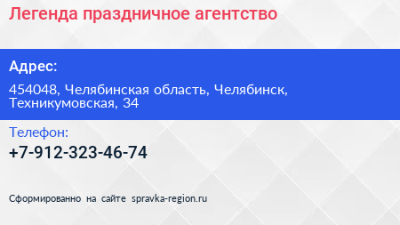 Легенда, праздничное агентство по адресу 454048, Челябинская область, Челябинск, Техникумовская, 34 в дальнейшем Организация, размещена в следующих категориях: