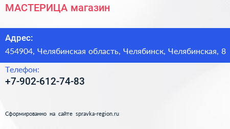 МАСТЕРИЦА, магазин по адресу 454904, Челябинская область, Челябинск, Челябинская, 8 в дальнейшем Организация, размещена в следующих категориях: