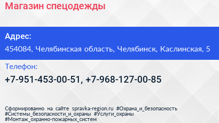 Магазин спецодежды по адресу 454084, Челябинская область, Челябинск, Каслинская, 5 в дальнейшем Организация, размещена в следующих категориях: