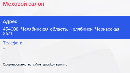 Меховой салон по адресу 454008, Челябинская область, Челябинск, Черкасская, 26/1 в дальнейшем Организация, размещена в следующих категориях: