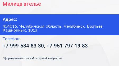 Милица, ателье по адресу 454016, Челябинская область, Челябинск, Братьев Кашириных, 101а в дальнейшем Организация, размещена в следующих категориях: