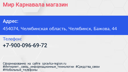 Мир Карнавала, магазин по адресу 454074, Челябинская область, Челябинск, Бажова, 44 в дальнейшем Организация, размещена в следующих категориях: