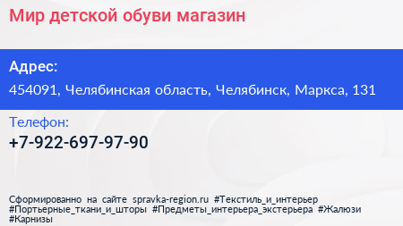 Мир детской обуви, магазин по адресу 454091, Челябинская область, Челябинск, Маркса, 131 в дальнейшем Организация, размещена в следующих категориях: