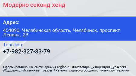 Модерно, секонд-хенд по адресу 454090, Челябинская область, Челябинск, проспект Ленина, 29 в дальнейшем Организация, размещена в следующих категориях: