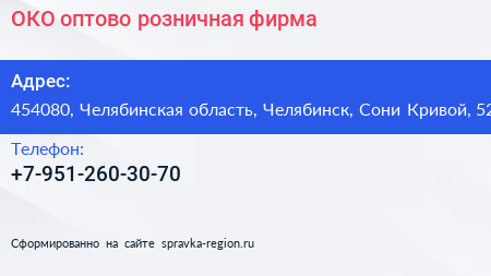 ОКО, оптово-розничная фирма по адресу 454080, Челябинская область, Челябинск, Сони Кривой, 52 в дальнейшем Организация, размещена в следующих категориях: