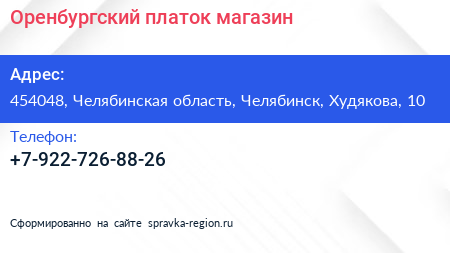 Оренбургский платок, магазин по адресу 454048, Челябинская область, Челябинск, Худякова, 10 в дальнейшем Организация, размещена в следующих категориях: