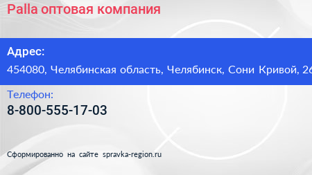 Palla, оптовая компания по адресу 454080, Челябинская область, Челябинск, Сони Кривой, 26 в дальнейшем Организация, размещена в следующих категориях: