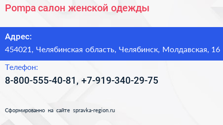 Pompa, салон женской одежды по адресу 454021, Челябинская область, Челябинск, Молдавская, 16 в дальнейшем Организация, размещена в следующих категориях: